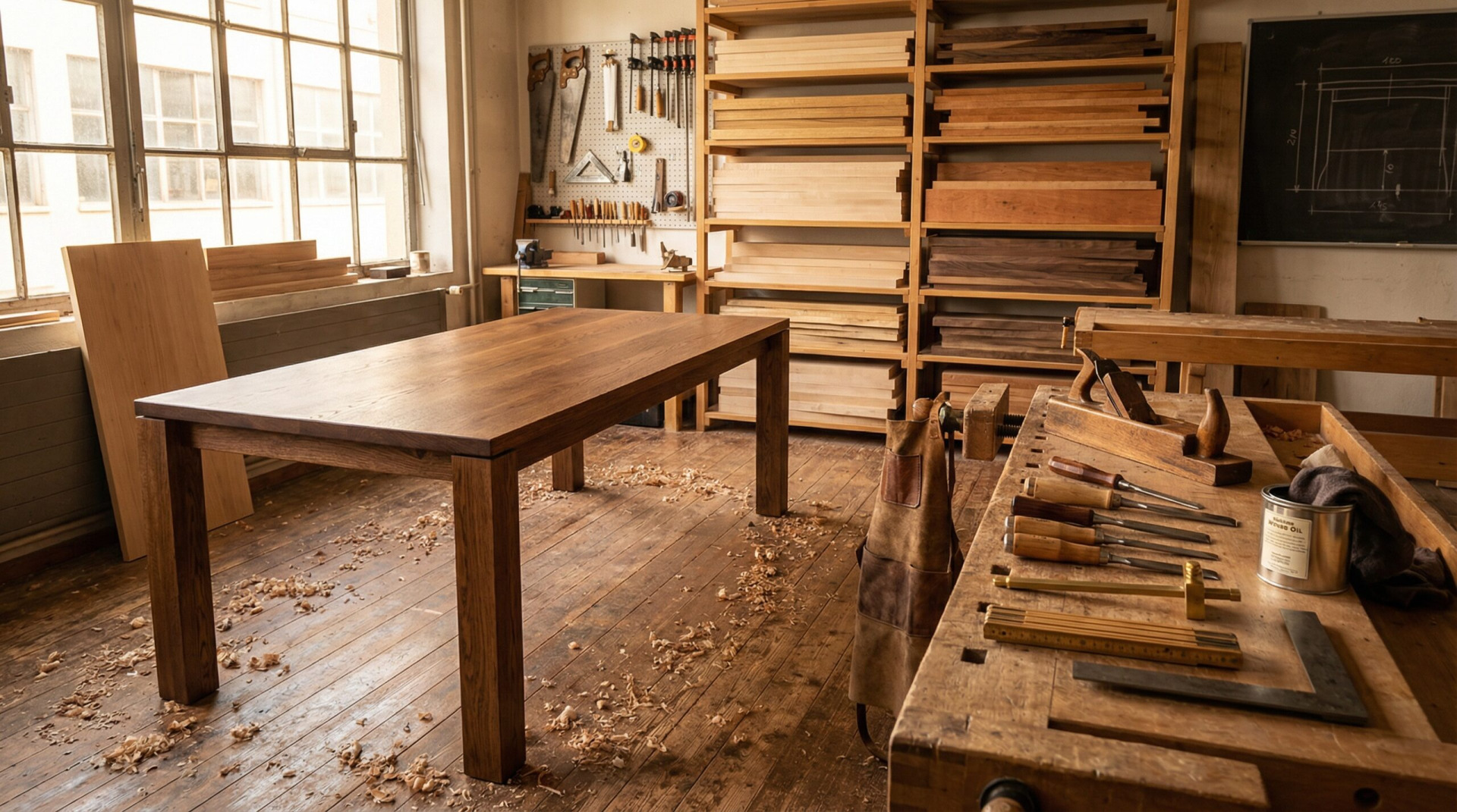 Tipp 1 – Holzart bewusst wählen: Buche und Esche sind robuste Hölzer, die deutlich günstiger sind als Nussbaum oder Kirschbaum. Für Alltagsmöbel wie Esstische und Regale reicht das vollkommen aus.