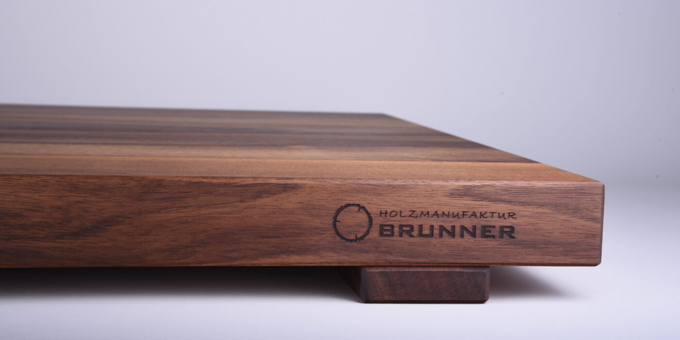 Jedes Brett wurde mit einer umlaufenden Saftrille versehen und an der Unterseite mit Anti-Rutsch-Füssen ausgestattet. Die persönliche Gravur – Namen und Hochzeitsdatum – wurde mit der Handbrennmaschine eingearbeitet.